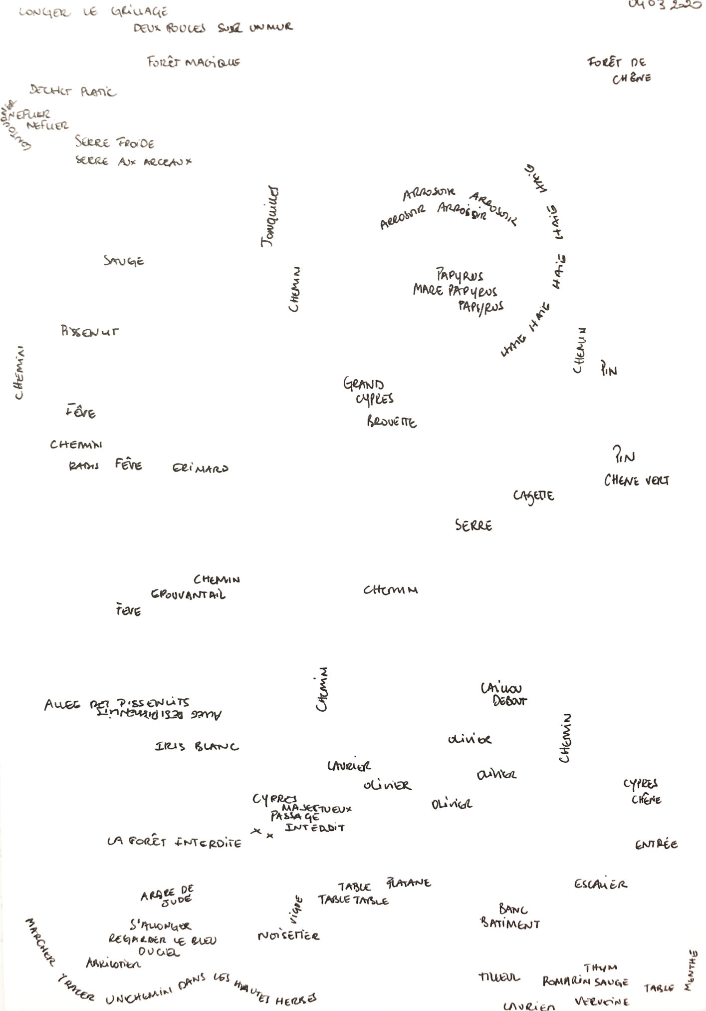 Ce jardin, je l’arpente et fais des boucles, la boucle devient cercle. Je tourne autour je tourne dans. Je trace des lignes des graphies, des photographies et de courtes vidéos, soundwalk, une écoute au monde qui survient.