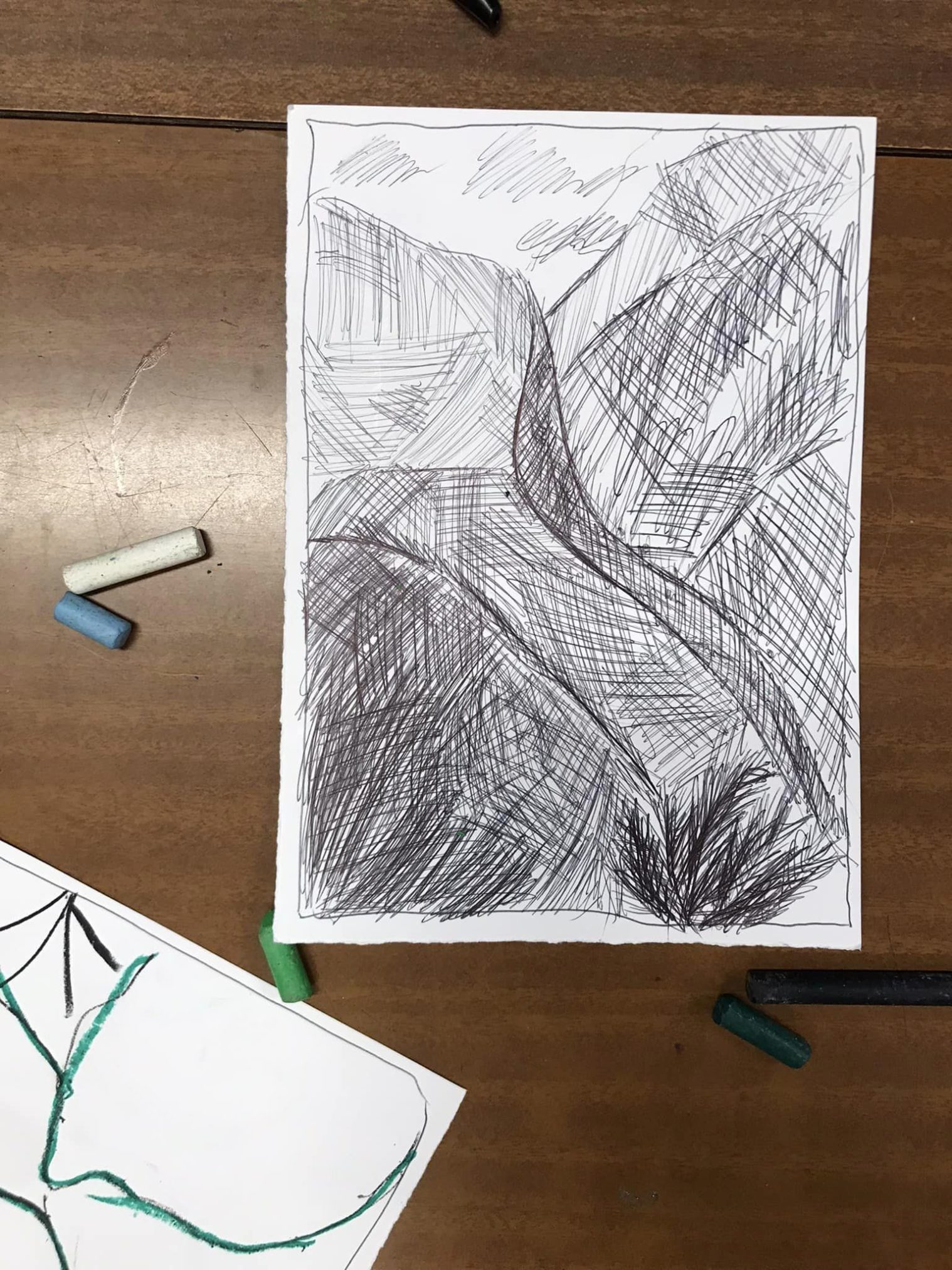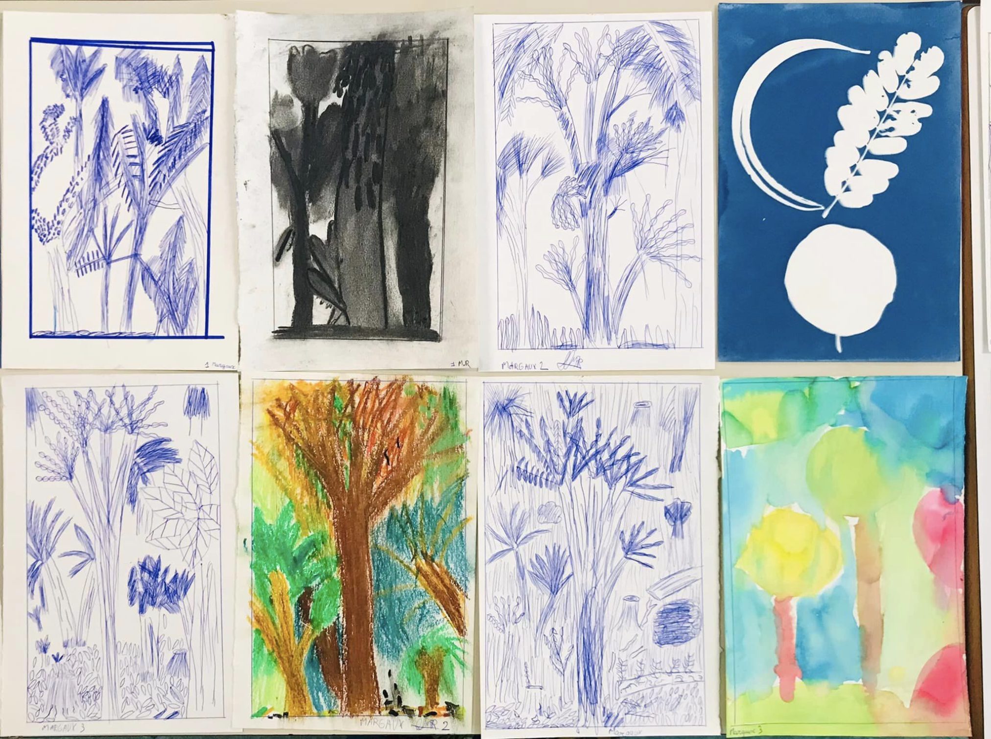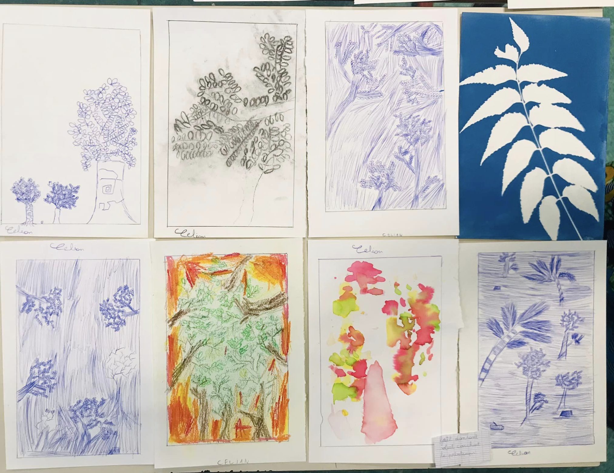 Dessins en classe, et de mémoire, au bic, pastels, fusain, à l’encre…