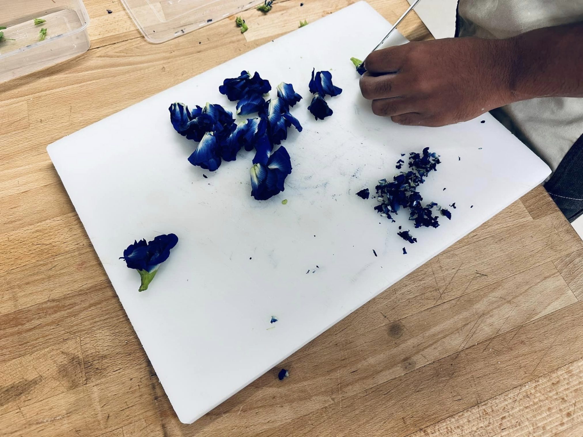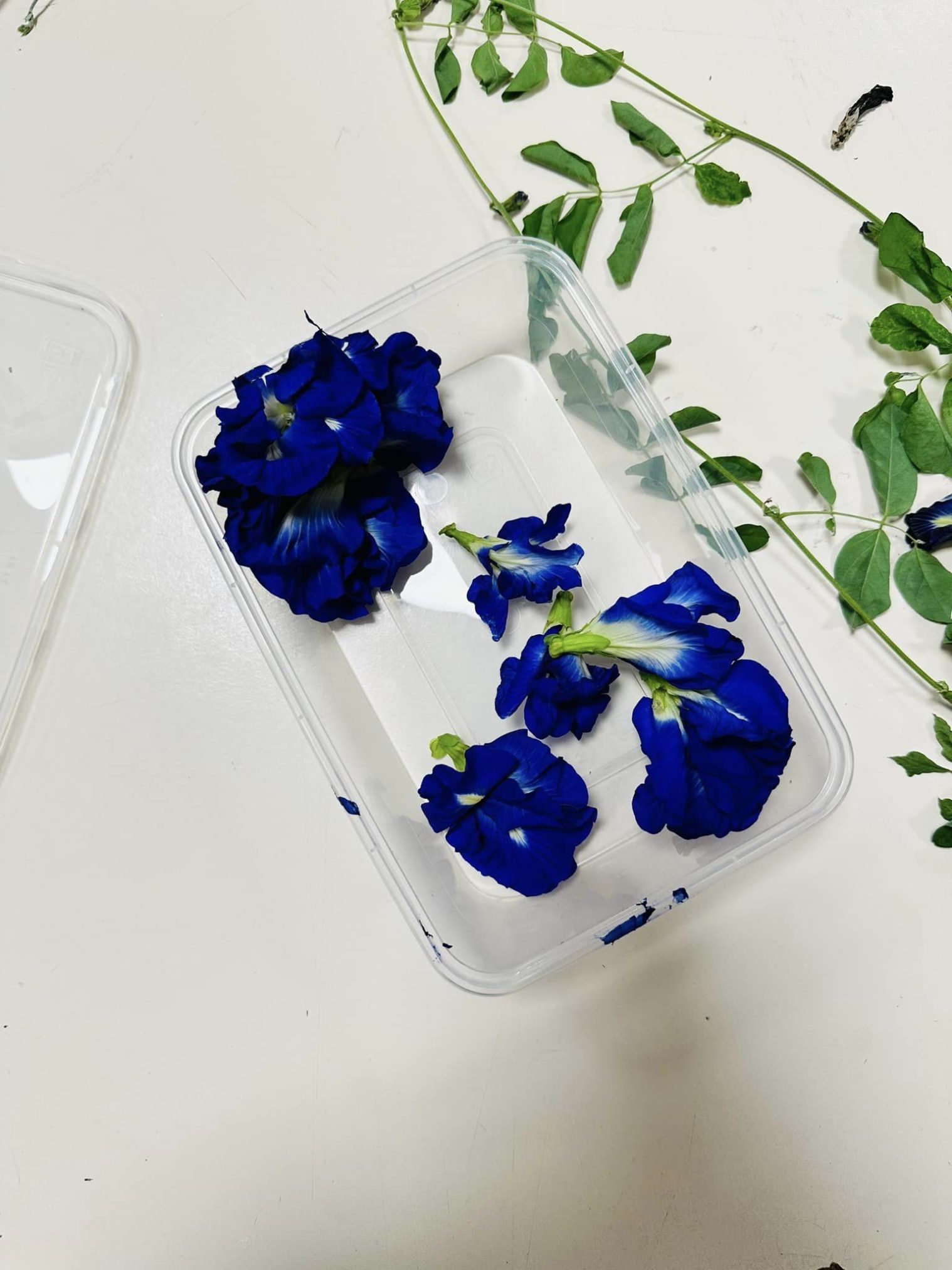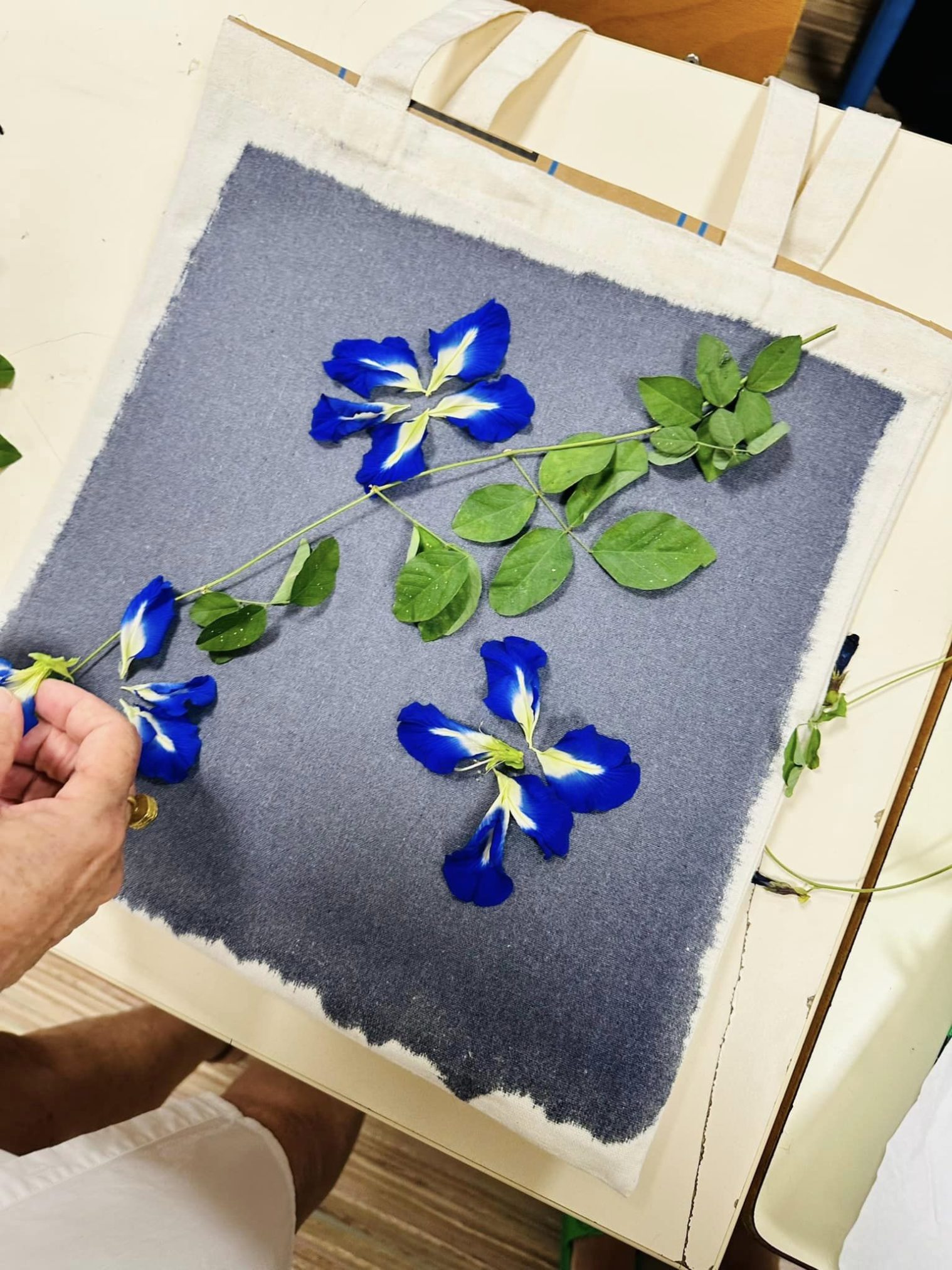 Réalisation de cyanotypes sur tote bag (emballage) à partir de fleurs comestibles trouvées à La Réunion : la Clitoria ou pois bleu – fleurs elles-mêmes utilisées pour colorer pains et pains de mie.