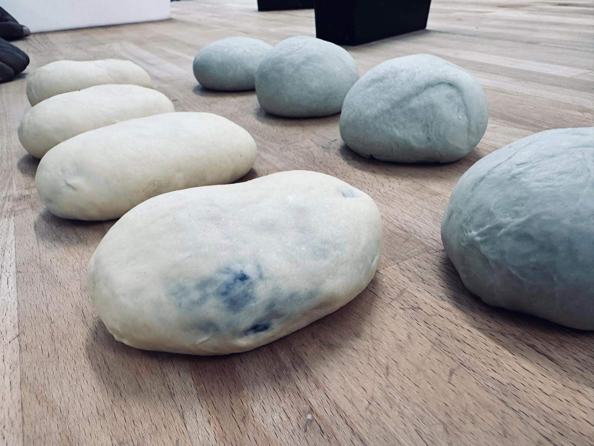 En parallèle fabrication de pains de différentes formes la broderie rehaussant le leurre de la vaisselle sur le cyanotype.