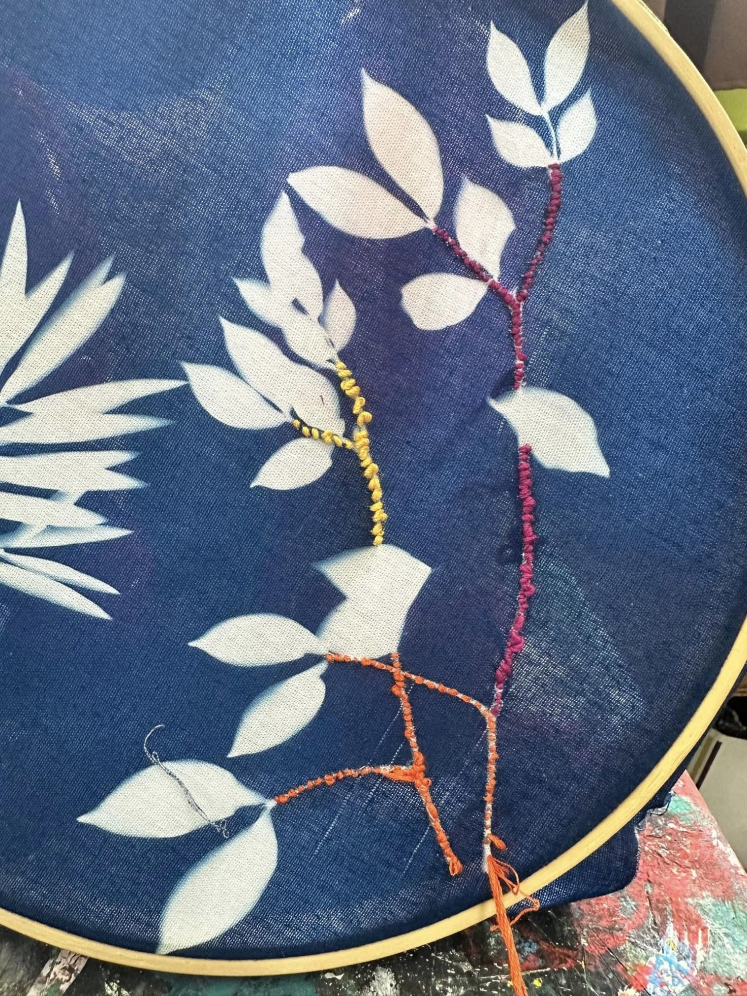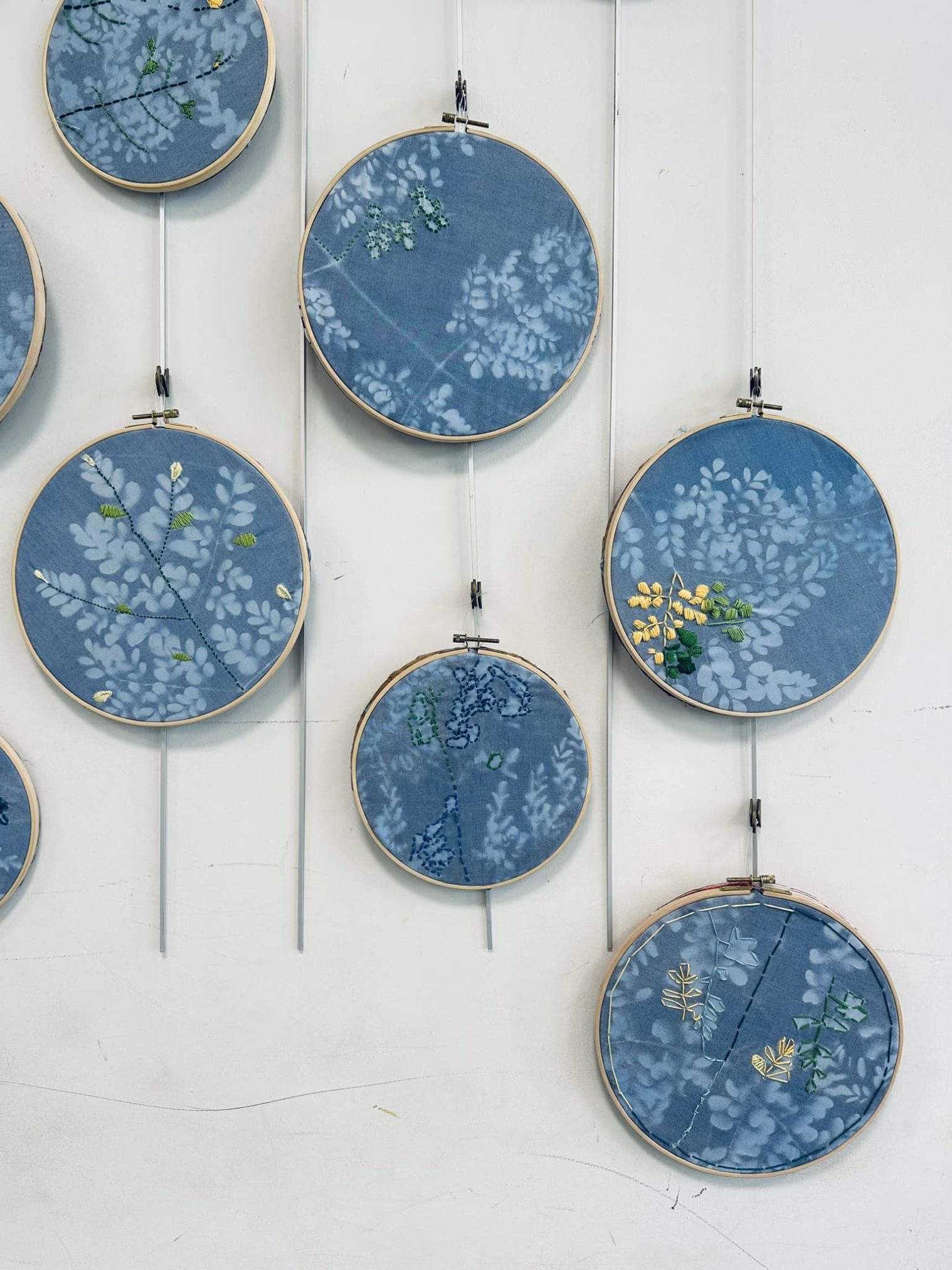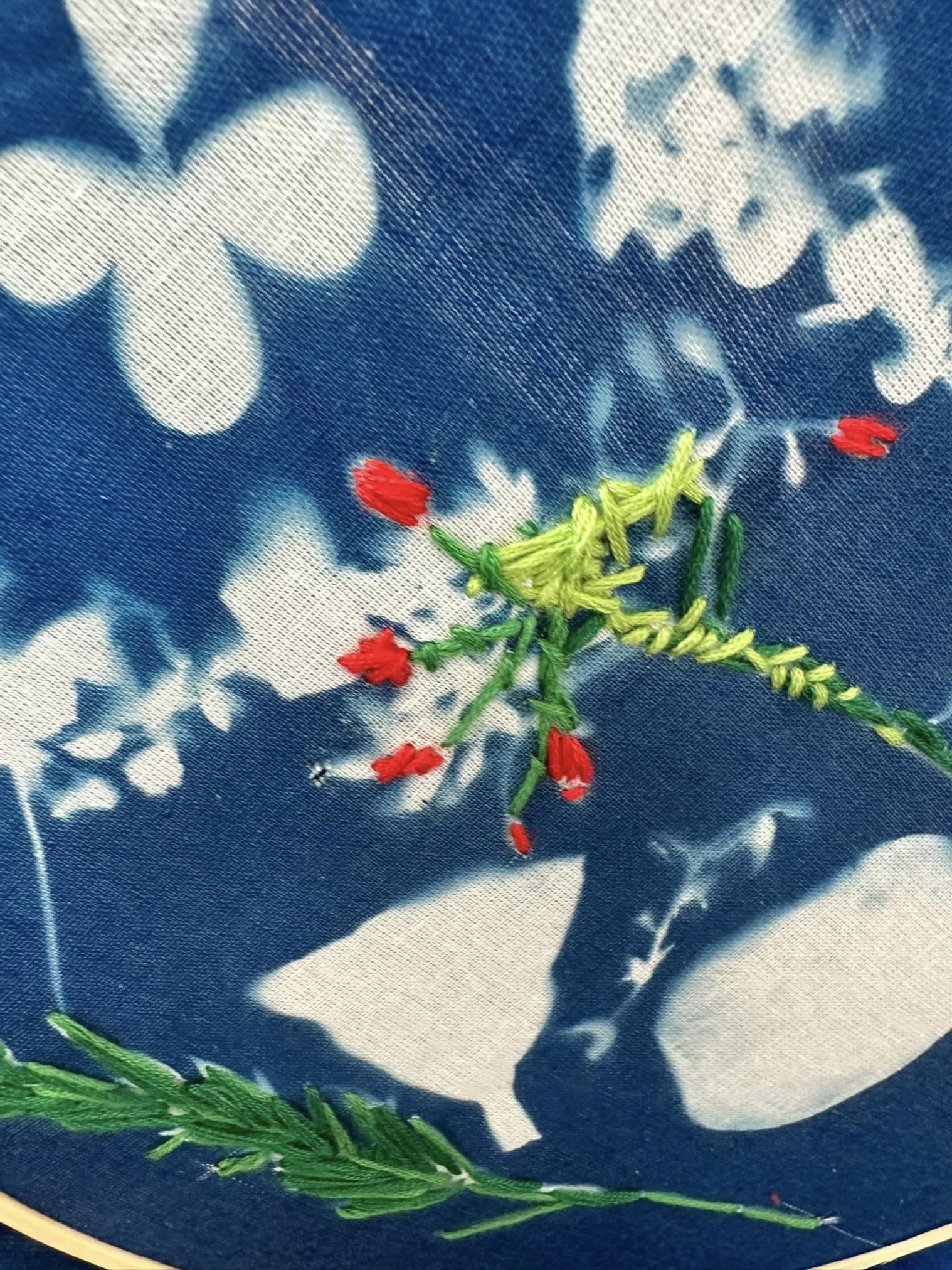 Les cyanotypes sont rehaussés de broderie : Entre réparation et propagation, broderies graphiques amènent une autre lecture qui contraste avec la forme des végétaux.