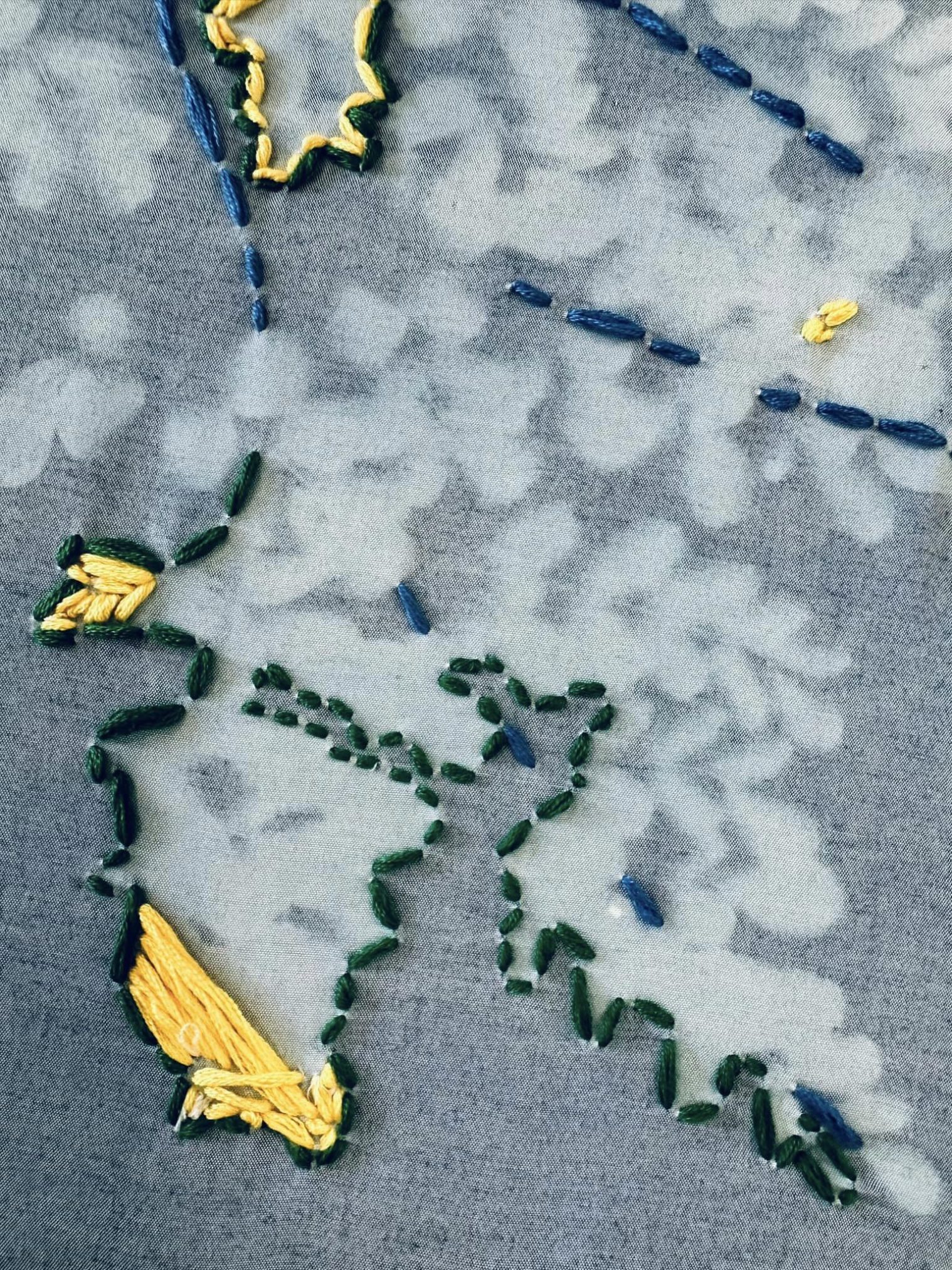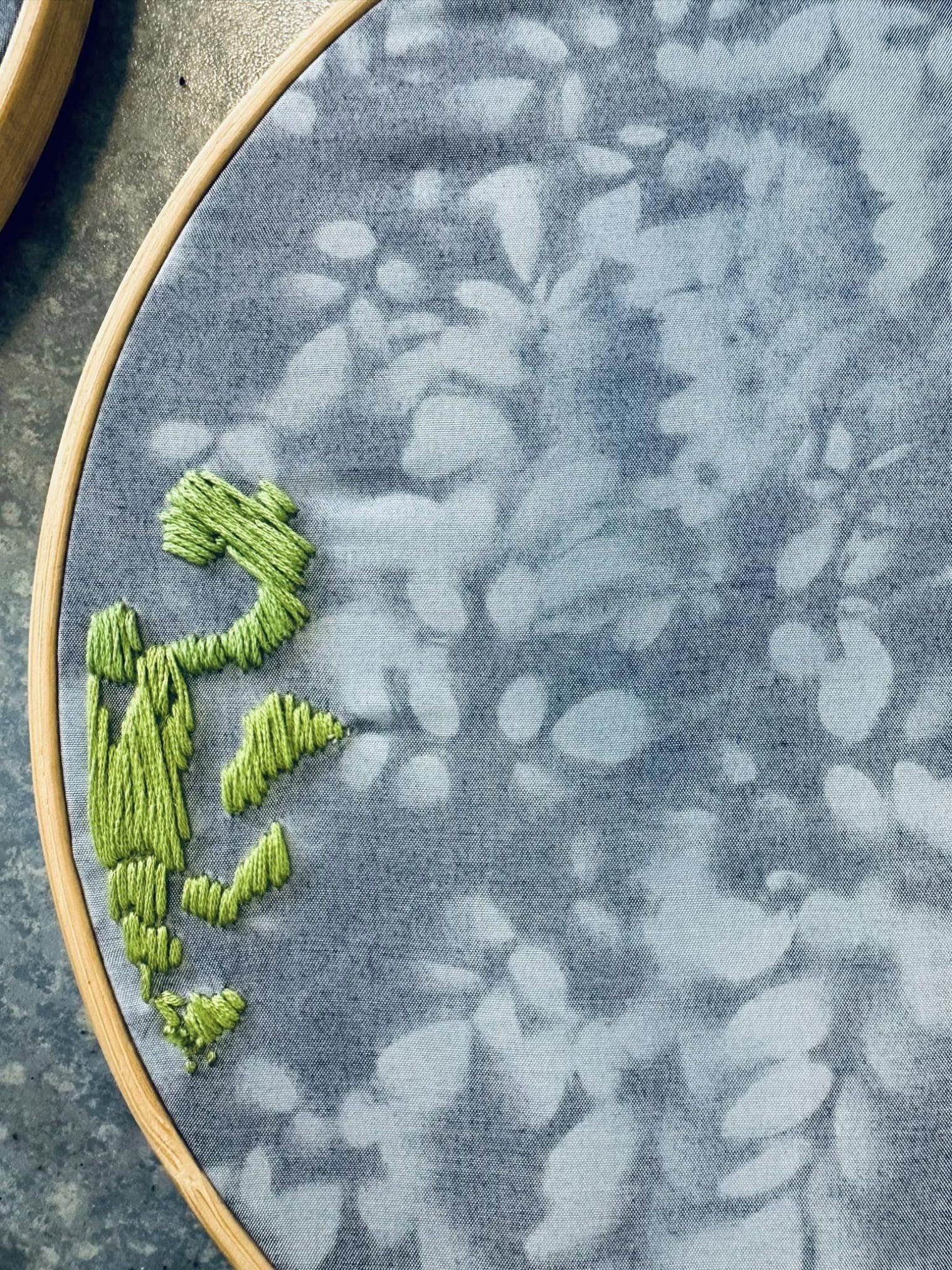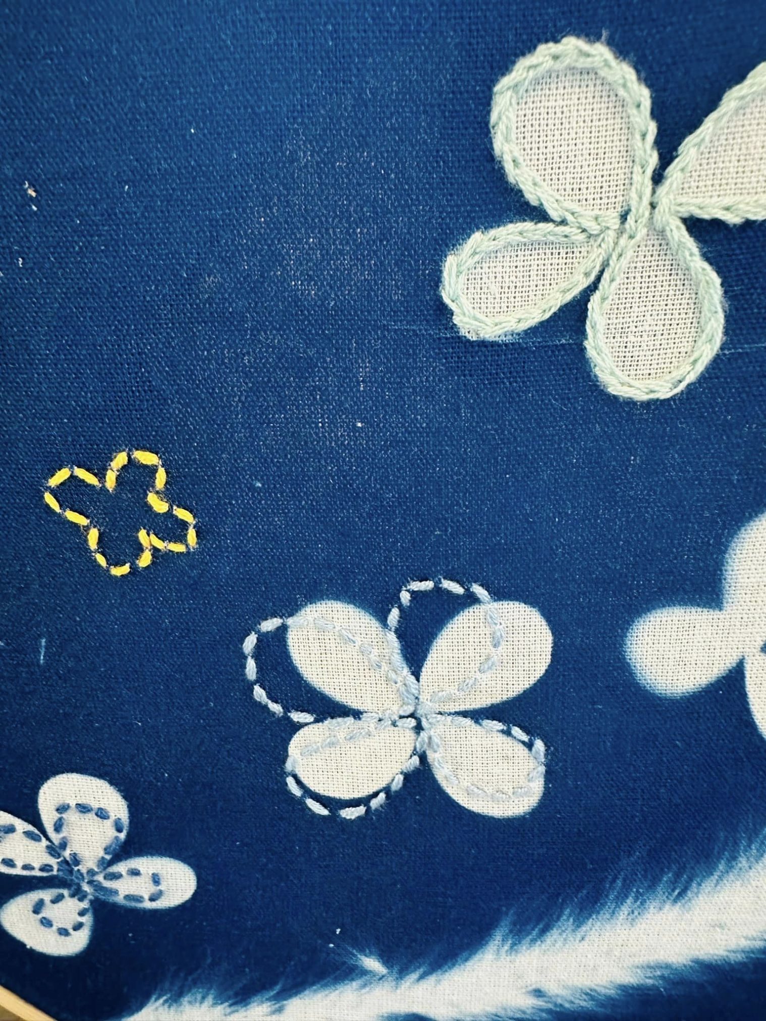 Les cyanotypes sont rehaussés de broderie : Entre réparation et propagation, broderies graphiques amènent une autre lecture qui contraste avec la forme des végétaux.