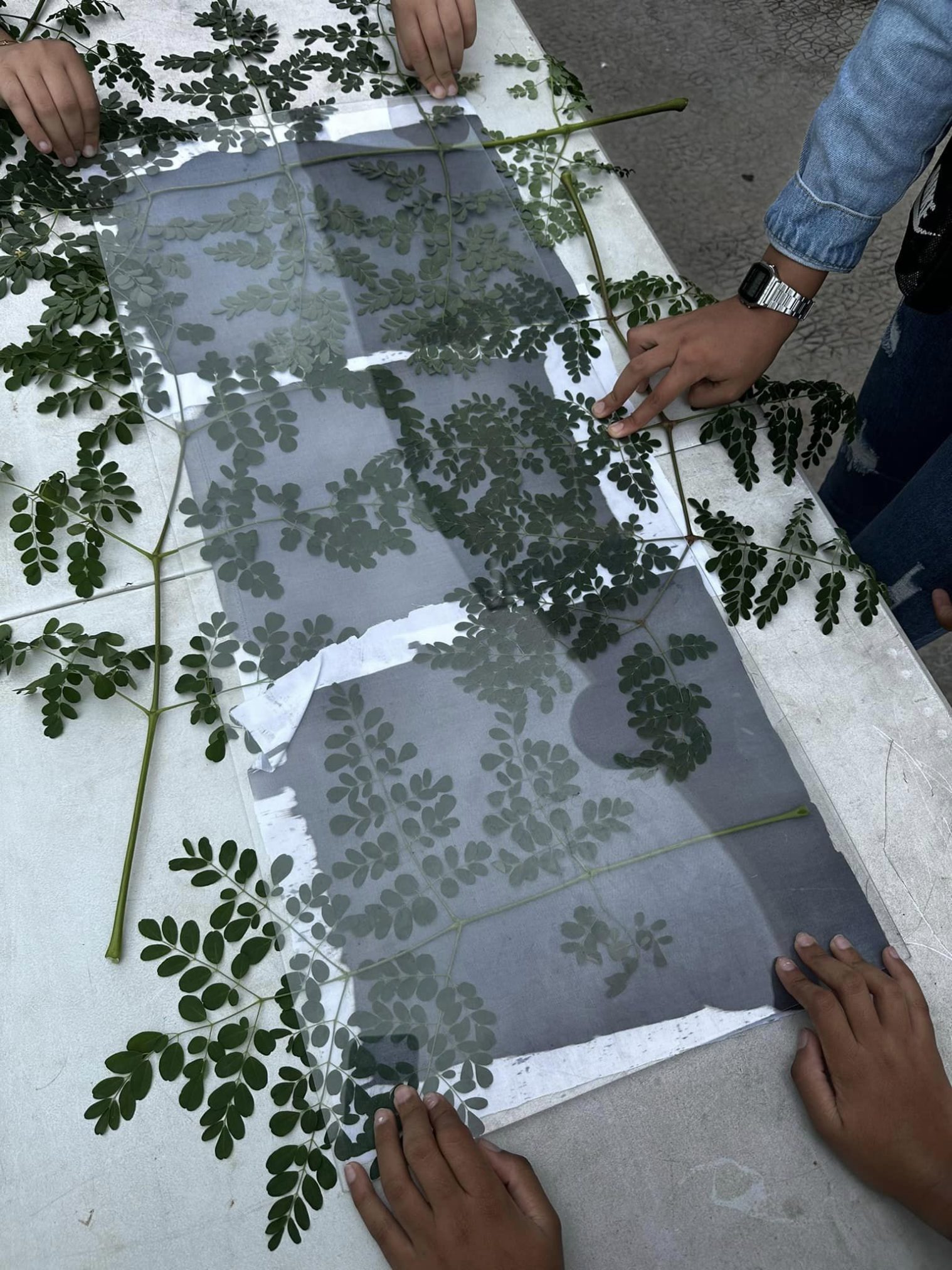 C’est à partir de l’arboretum du lycée que nous avons capté « l’âme » des espèces végétale par l’ombre projetée sur des tissus grand format en utilisant la technique du cyanotype et ce, après avoir construit un cadre de même taille.