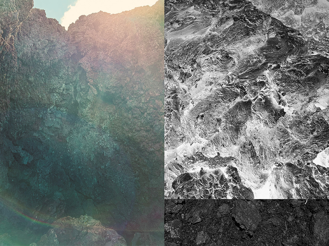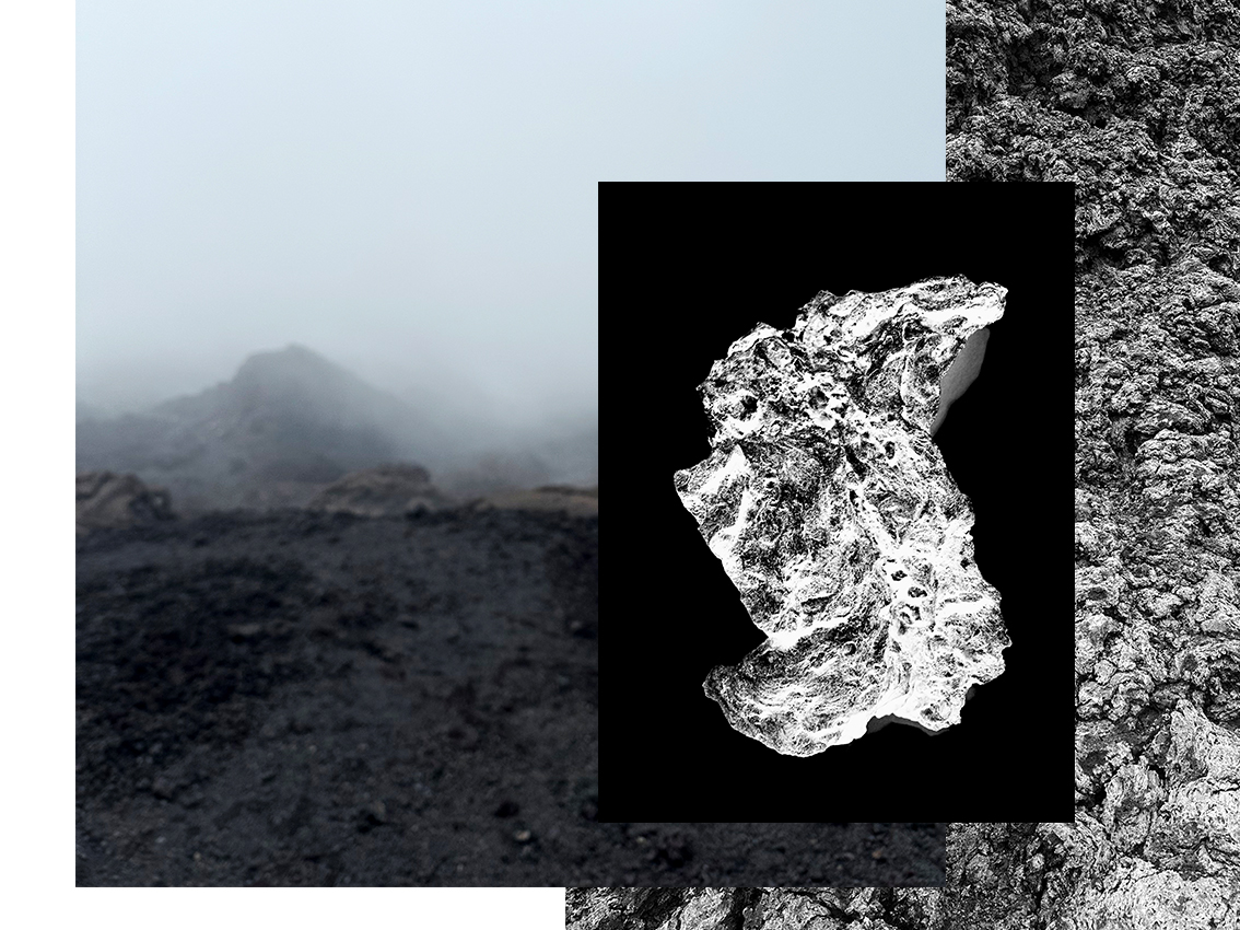 Le basalte étoilé du ciel* se veut un voyage visuel sur des îles volcaniques, que j’explore comme autant de laboratoires à ciel ouvert, où le minéral est sujet. Mes images naissent d’immersions dans le paysage, immersions sensibles et vibratoires, et se prolongent dans l’atelier par un travail de transformation. Je photographie les paysages, la roche, les plis et les fractures de la terre.