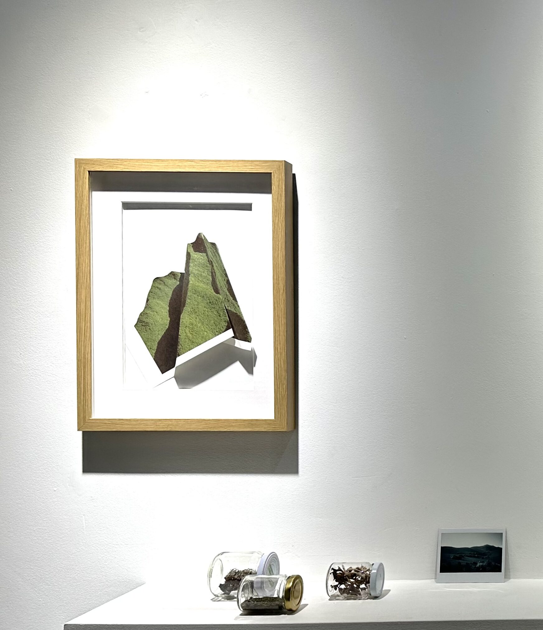 Dans une même installation le regard marche avec le déplacement du corps. De près, de loin : d’une image de format de 60 x 80 cm, il passe à un détail plus petit puis à un instantané plus intime. On s’approche, on recule, on se rapproche. Dans les assemblages, des zones sont occultées par des recouvrements, des chevauchements. Quelque chose pourrait disparaître. Un part de mystère. Des grands espaces lâchent une roche isolée. A l’instar du terrain, les fragments s’animent de strates. Une tablette déploie une superposition d’images expérimentales de formats et de papiers différents, insérée dans l’ensemble. Le traversant, elle offre des objets de récolte : mousses, pierres, graines, feuilles et cheveux de pelé voisinant avec, des images pliées, encadrées dans des cadres-vitrines de 30 x 40 cm, des papiers déchirés, ainsi qu’un leporello-carnet de recherches. La richesse des contenus de ces montages se déploie dans un ensemble clair, aéré et structuré. Au bord du reportage la fiction l’emporte.