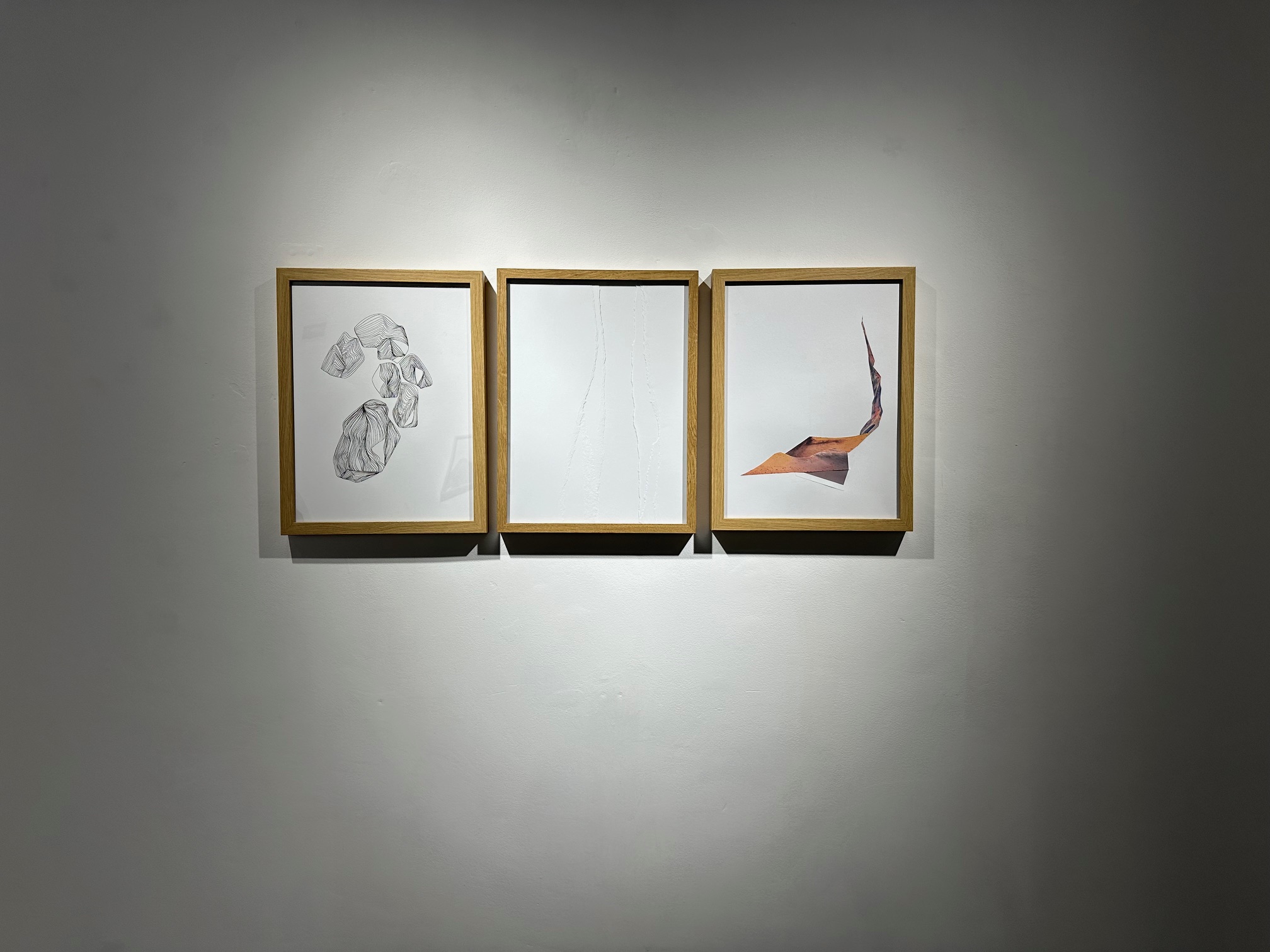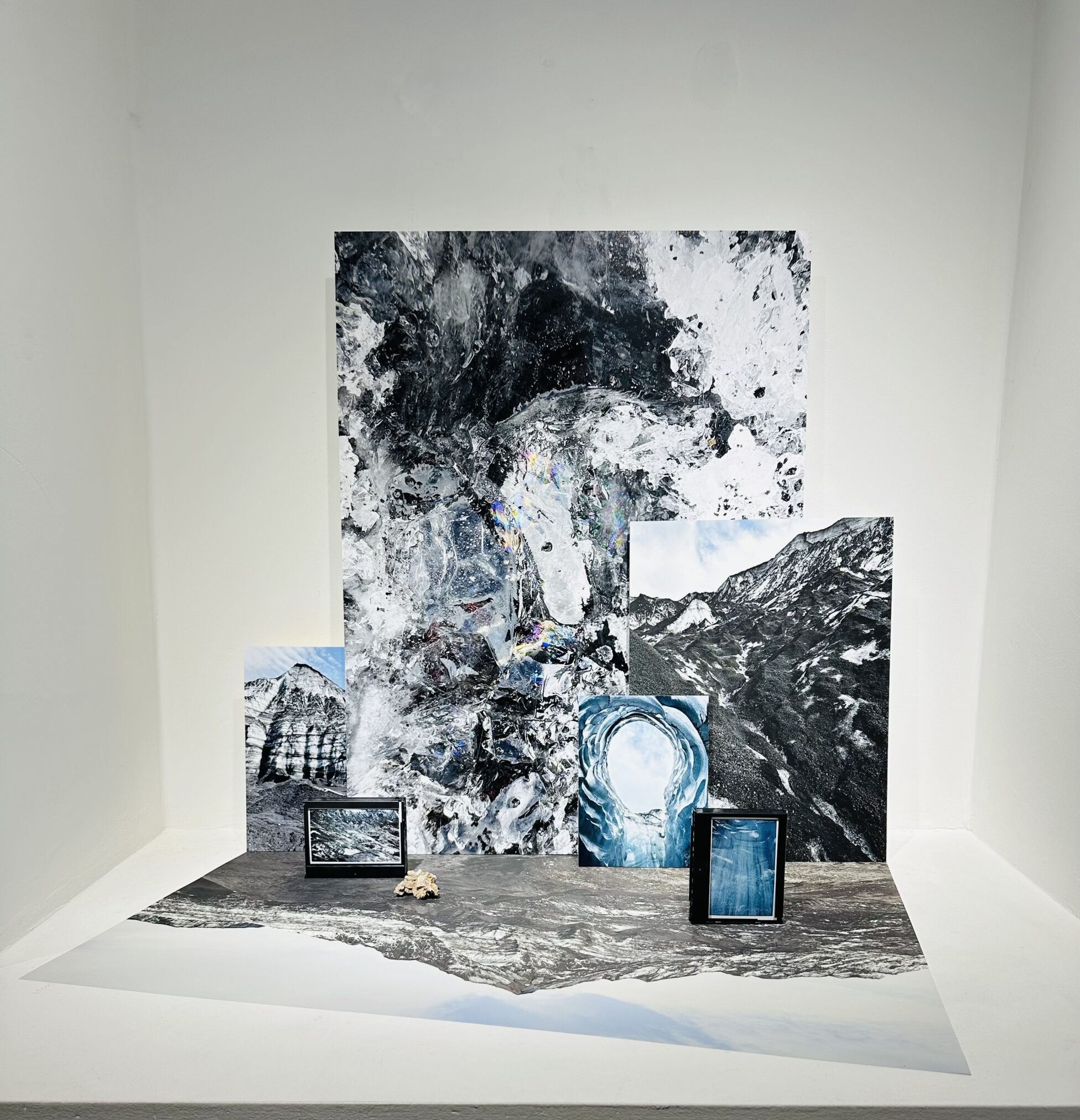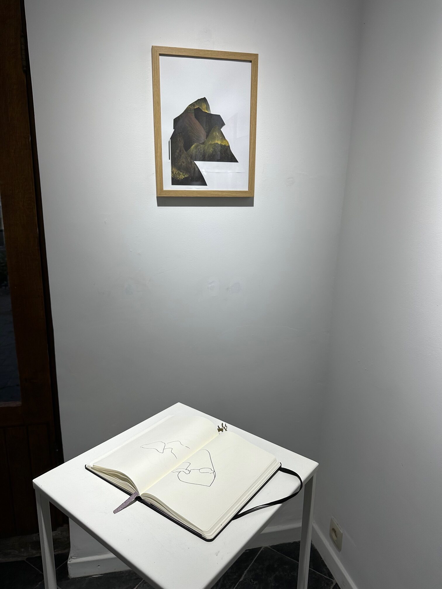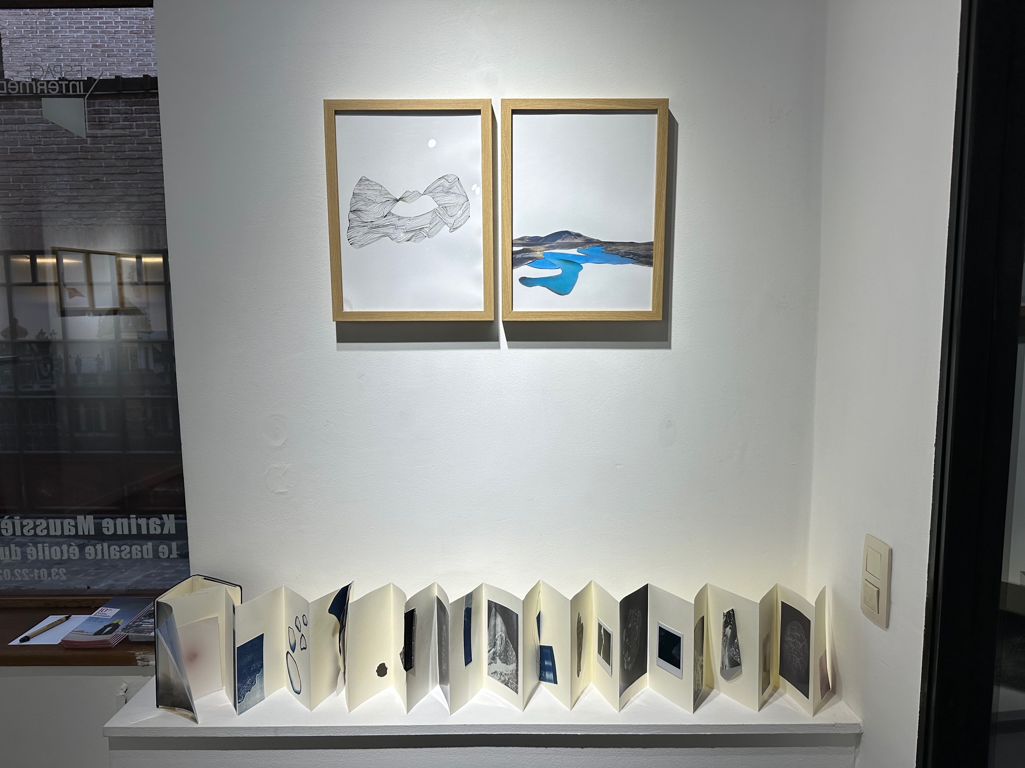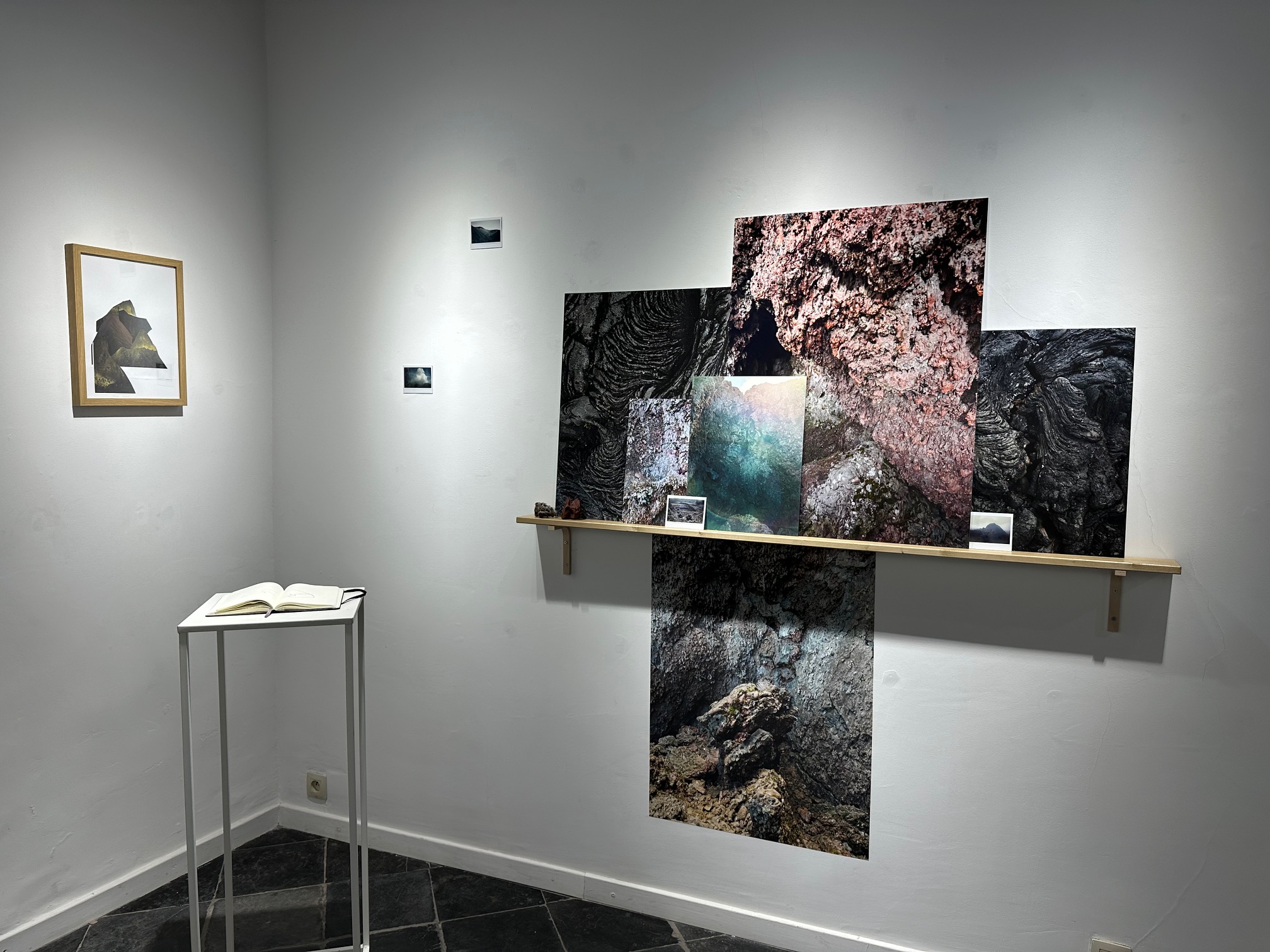 Assemblages superpositions d’images de formats variés aux textures différentes. Pliages, collages, dessins, et roches basaltiques accompagnent.