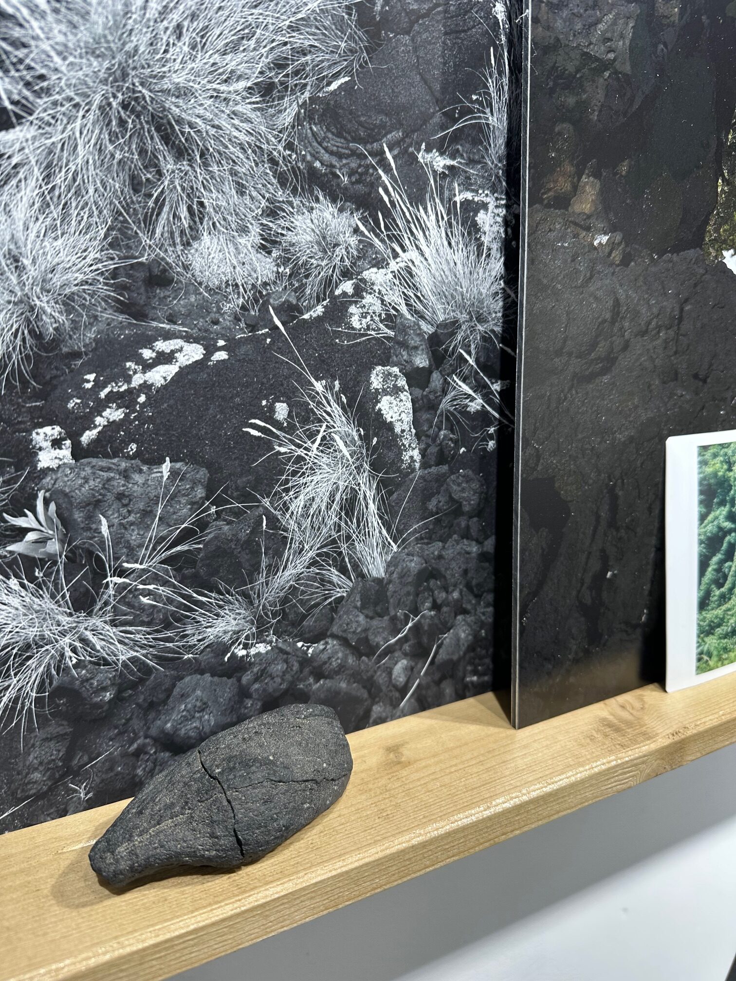 Les photographies en couleur et en noir et blanc sont alors saisies dans un dispositif qui présente non plus seulement des photographies mais des objets hybrides. Les installations, reprenant le langage poétique de chaque territoire, nous embarquent dans un voyage quasi sensoriel ; on tremble avec la terre, on sillonne entre les fumées, puis une trouée de bleu, de mer ou de ciel et tout s’ouvre. Pris au cœur des matières végétales et minérales, le spectateur est à son tour comme pétri par les éléments naturels. Il fait partie du tourbillon chaotique, du magma des origines. Il fait corps avec le mouvement des forces telluriques et cosmiques. Il fend les passages et les transitions du relief. Du désert il passe à une luxuriante forêt. Enfin il vacille au bord du cratère, entre impression de puissance et de vulnérabilité.